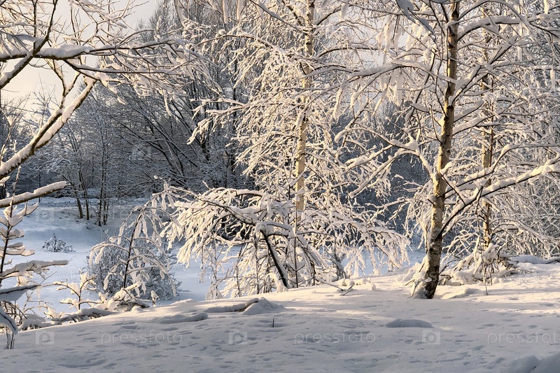 Заснеженные ветки деревьев в солнечном свете зимний пейзаж