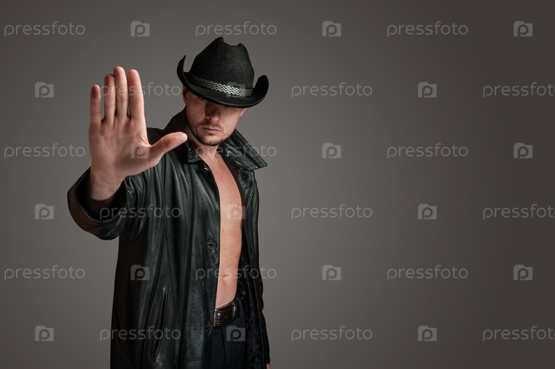Ковбой в кожаном пальто делает жест отрицания рукой. Остановить жест