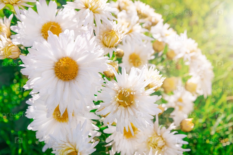 Летние яркие цветы, растущие на земле, освещенной солнцем. Белые красивые кустовые хризантемы на фоне зеленой травы