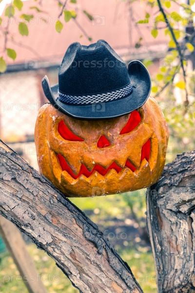 Хэллоуинская тыква в ковбойской шляпе и светящимися красными глазами