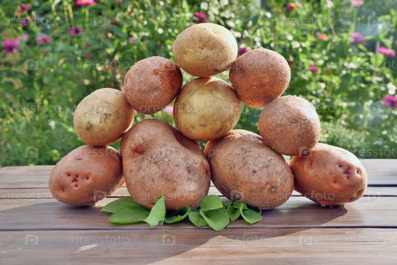 Свежий выкопанный картофель на деревянном столе и на фоне зеленых листьев