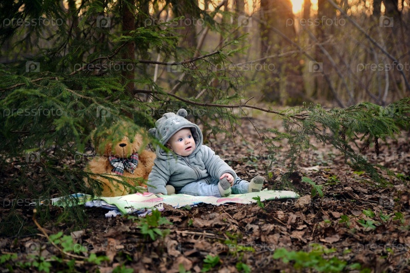 Маленький ребенок с игрушкой отдыхает в парке на закате
