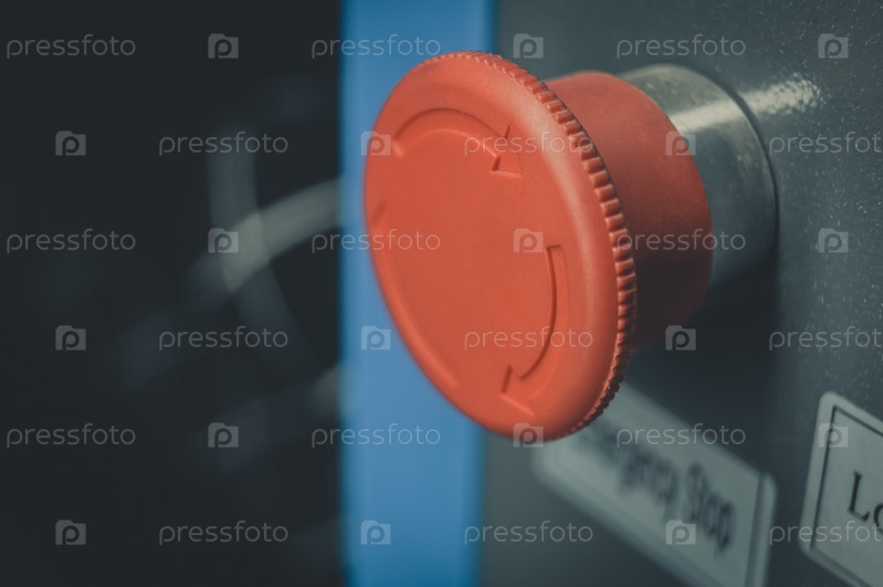 Тревожная кнопка. Большая красная кнопка аварийной остановки производственного оборудования на заводе. Управление машиной. Система безопасности оборудования. Селективный фокус