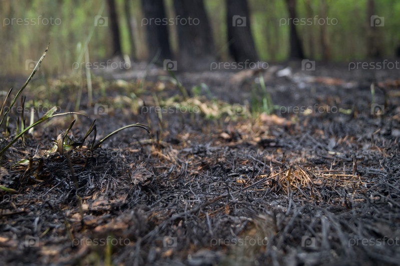 Последствия лесного пожара. Зола от сгоревшей травы и веток. Сгоревшие растения в лесу. Природная катастрофа. Потушенный лесной пожар. Селективный фокус