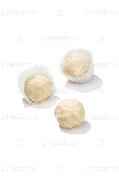 Шоколадная конфета белый трюфель на белом фоне