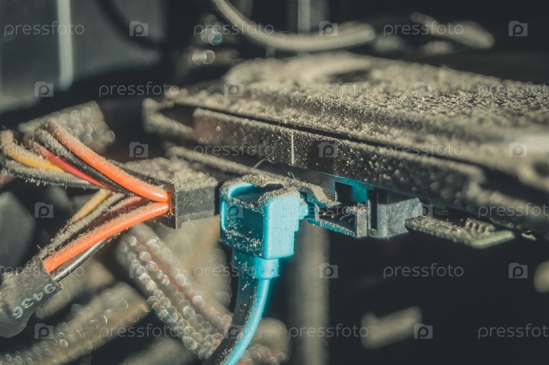 Пыльные провода подключения жесткого диска на настольном компьютере. Слой пыли и грязи на изоляции силовых кабелей. Селективный фокус