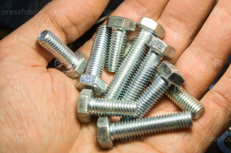 Несколько металлических болтов. Крепления на ладони. Крупный план оборудования в руке. Мягкий фокус