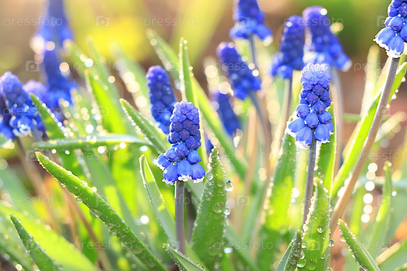 Абстрактный цветочный фон с размытым фоном и боке. Нежные цветы мускари с каплями росы после дождя в весеннем саду. Концепция весеннего прибытия, цветочная открытка, шаблон для дизайна