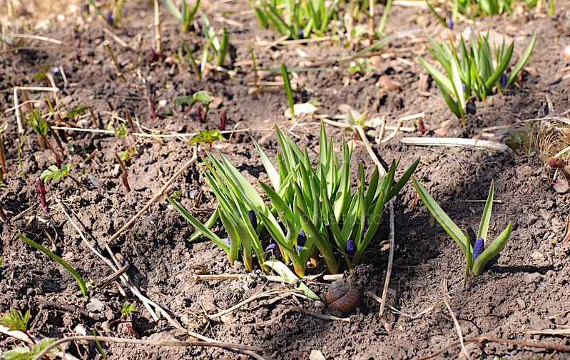 Нежные первые цветы мускари в весеннем саду. Абстрактный цветочный фон, баннер. Концепция прихода весны, цветочная открытка, шаблон для дизайна, выборочный фокус