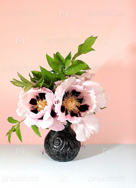 Абстрактная цветочная композиция, домашний интерьер с красивыми весенними горными пионами в вазе, весенний баннер, натюрморт с местом для текста, цветочная праздничная открытка, выборочный фокус