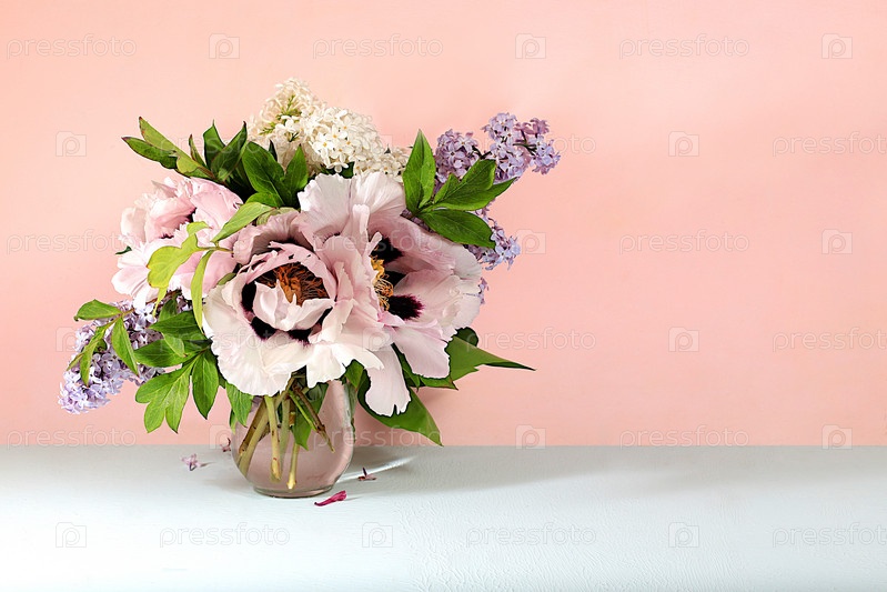 Абстрактная цветочная композиция, домашний интерьер с красивыми весенними горными пионами и сиреневыми ветвями в вазе, весенний баннер, натюрморт с местом для текста, цветочная праздничная открытка, выборочный фокус