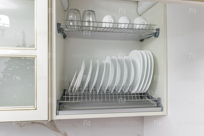 Чисто белая чашка с тарелкой, стоящая в белом шкафу