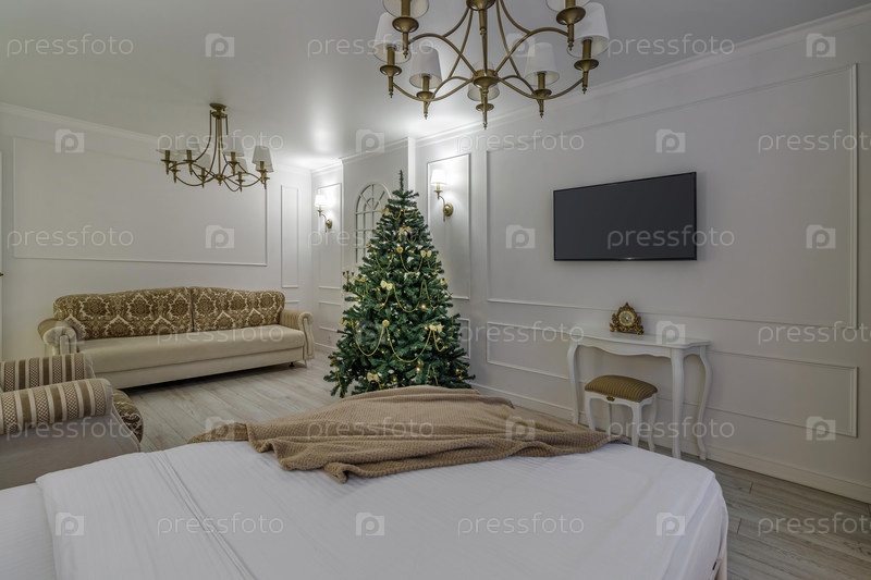 Скандинавский, уютный интерьер гостиной с рождественской елкой, белыми тонами, журнальным столиком и диваном