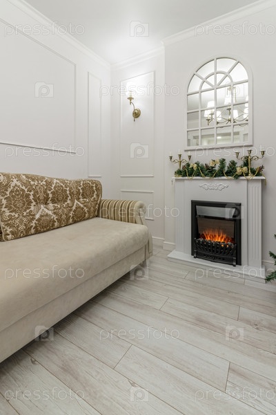 Интерьер в светлых тонах с биокамином, освещенным горящими бра на стене