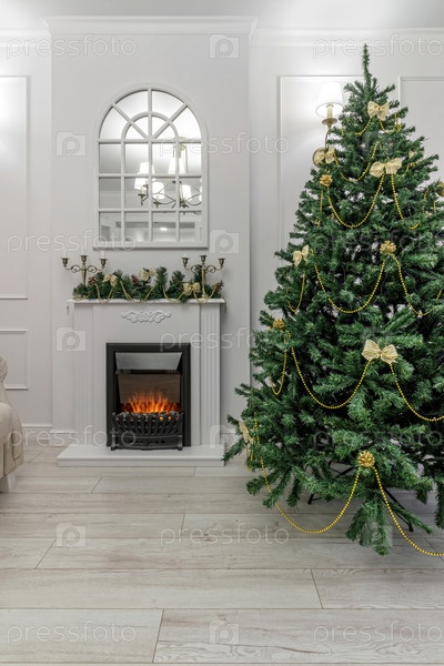 Скандинавский, уютный интерьер гостиной с рождественской елкой, белыми тонами, журнальным столиком и диваном
