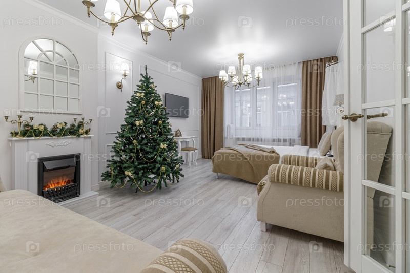 Скандинавский, уютный интерьер гостиной с рождественской елкой, белыми тонами, журнальным столиком и диваном