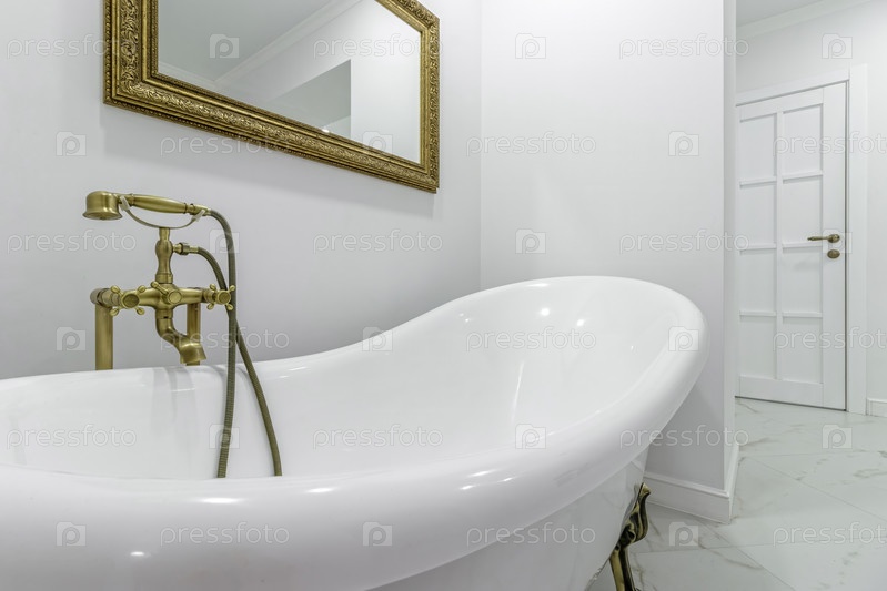 Отдельно стоящая чаша для ванны, расположенная в коридоре квартиры, с золотыми ножками и большим зеркалом на стене