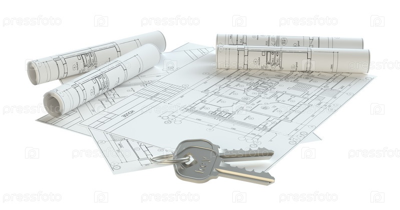 Большой план ключей на планах дома. изолированы на белом цвете. 3D-иллюстрация