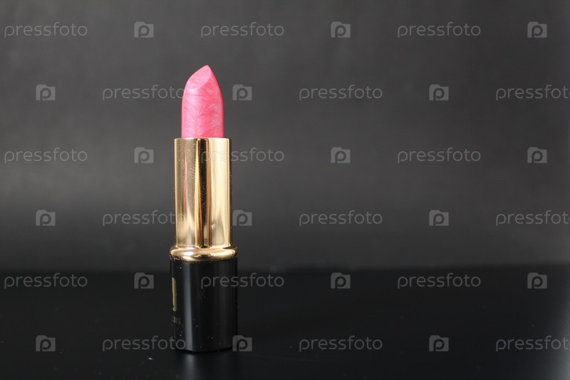 Красно-розовая помада с черно-золотой упаковкой тюбика на черно-красном фоне с местом для копирования текста. Макияж Уход за собой Тип красоты по цветотипу