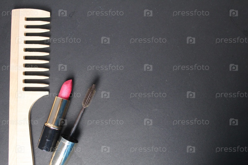 Деревянная расческа для помады и туши на черном фоне с местом для текста и копирования. Утренний макияж для приведения себя в порядок