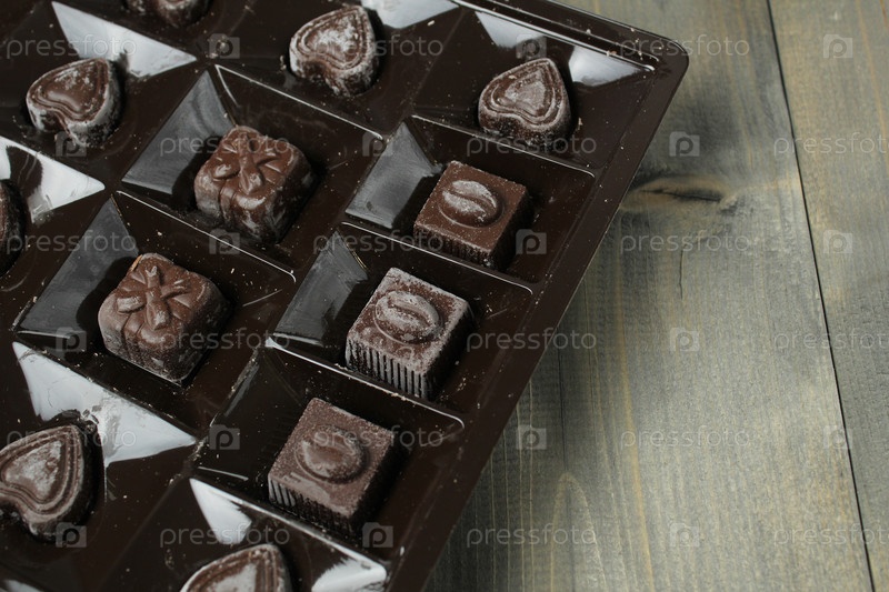 Шоколадные конфеты в коробке коррекса на фоне рома. Праздничный подарок для хранения конфет