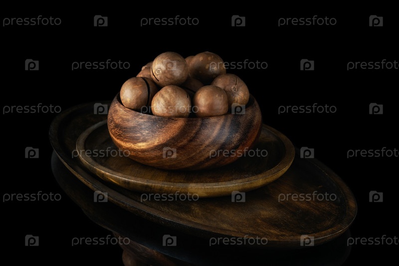 Орехи макадамии в скорлупе в деревянной миске на деревянных тарелках на черном фоне. Коричневые тона, теплые тона. Крупный план. Селективный фокус. Студийный снимок. Горизонтальный