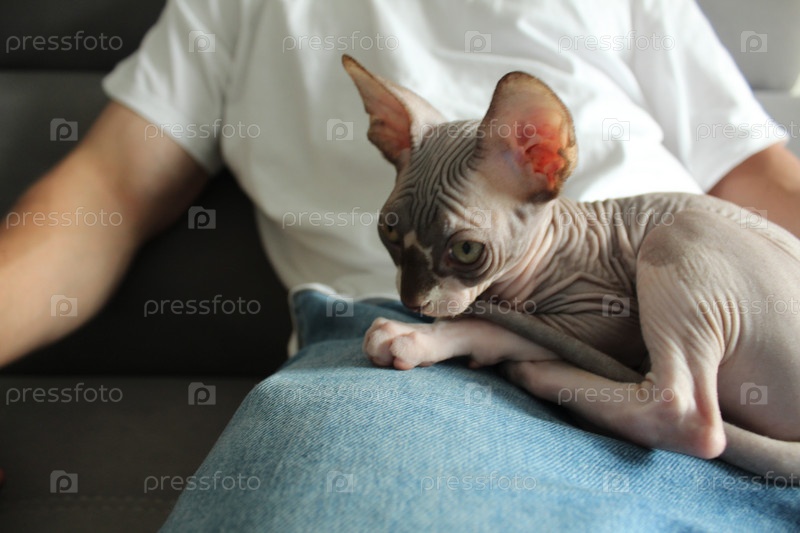 Серый сфинкс лежит в руках своего владельца. Необычные домашние животные, кошки. Безволосый кот