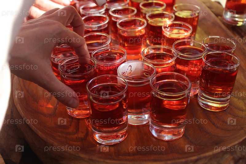 Красная спиртовая настойка в маленьких стаканах разбирается людьми. Алкогольные домашние напитки