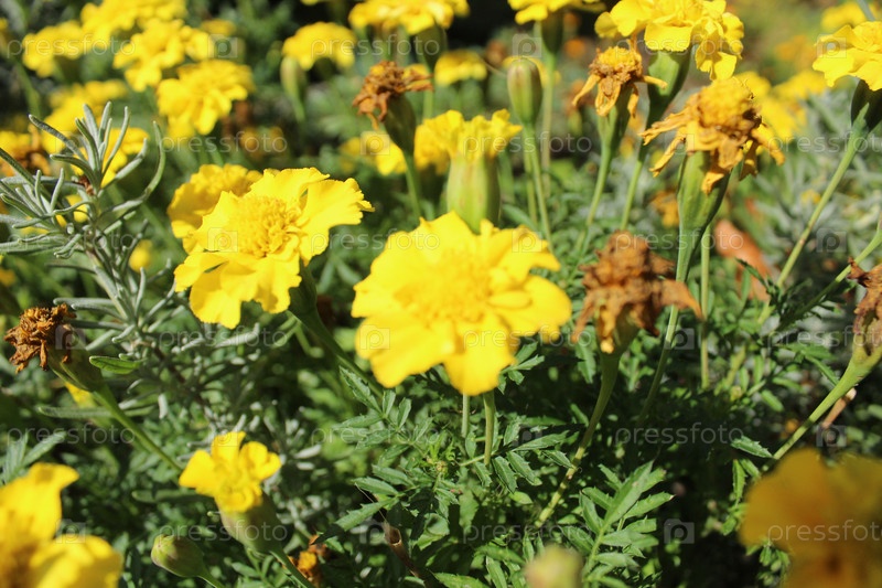 Желтые бархатцы крупным планом в солнечный летний день на городской клумбе. Подбор цветов для озеленения города