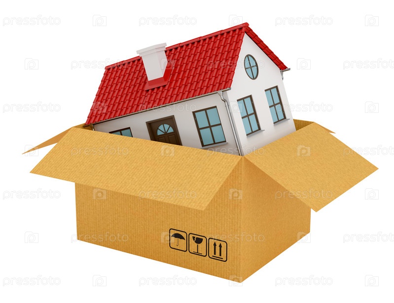 Дом с красной крышей в открытой картонной коробке