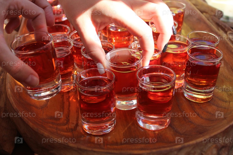 Красная спиртовая настойка на деревянном подносе. Питание с алкоголем
