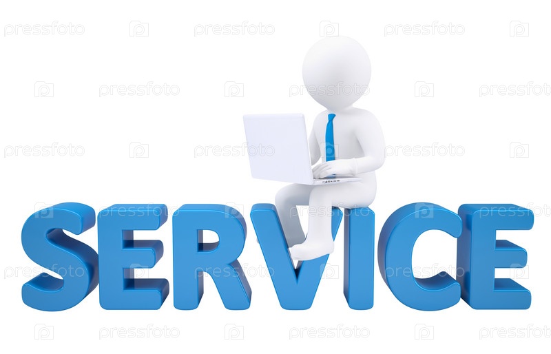 3D-человек с ноутбуком сидит на слове 'сервис'