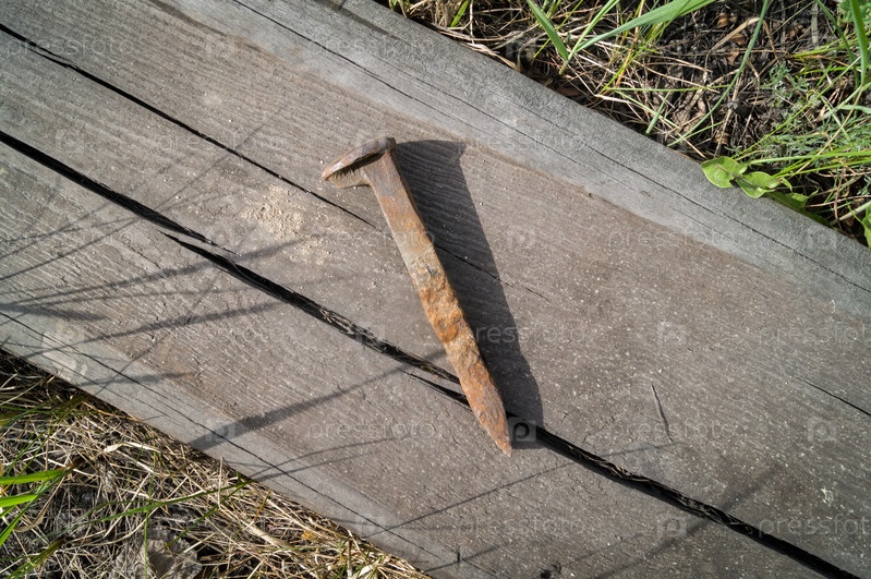 Ржавый рельсовый гвоздь для крепления рельсов к деревянным шпалам. Специальный гвоздь для железной дороги. Рельсовый шип. Селективный фокус