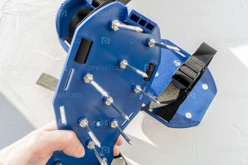 Ножной аэратор для заливки бетонного пола и аэрации газона. Аэрационные босоножки с шипами. Сделай сам. Строительные материалы и спецодежда. Селективный фокус