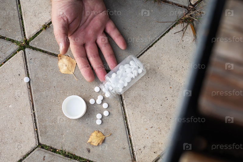 Таблетки падают из рук на землю, концепция на тему резкого ухудшения здоровья на улице