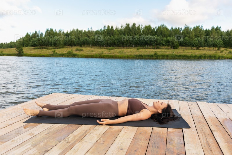 Стройная женщина выполняет расслабляющее упражнение шавасана после основной тренировки, занимается йогой в леггинсах и коротком топе, лежит на коврике на берегу озера