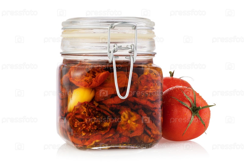 Банка вяленых помидоров на белом фоне