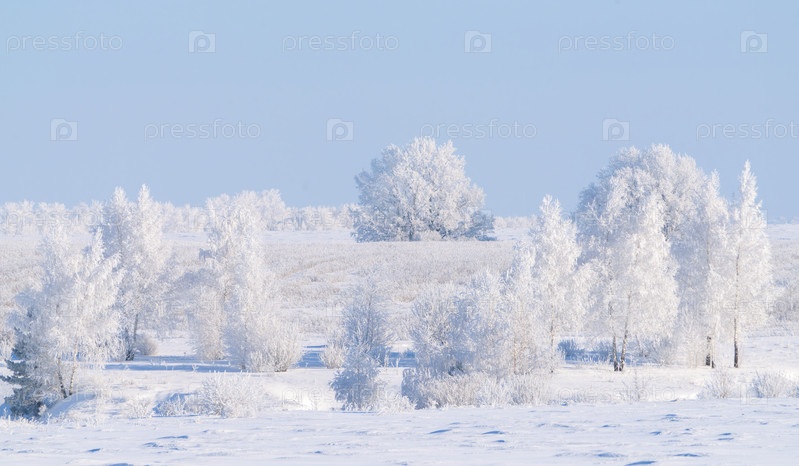 Замерзшая природа, деревья, покрытые толстым инеем в морозный зимний день