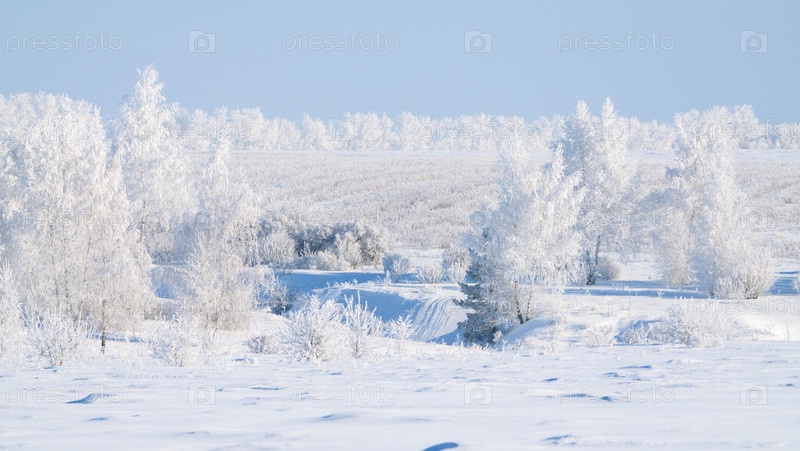 Замерзшая природа, деревья, покрытые толстым инеем в морозный зимний день