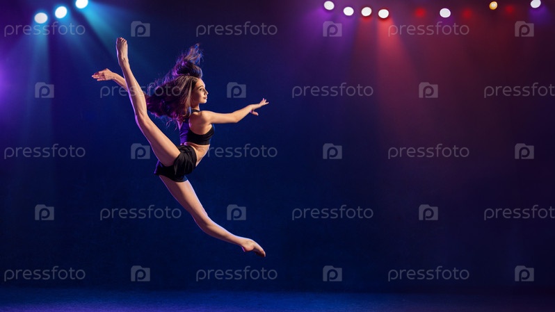 Молодая исполнительница современной хореографии танцует в центре внимания на черном фоне