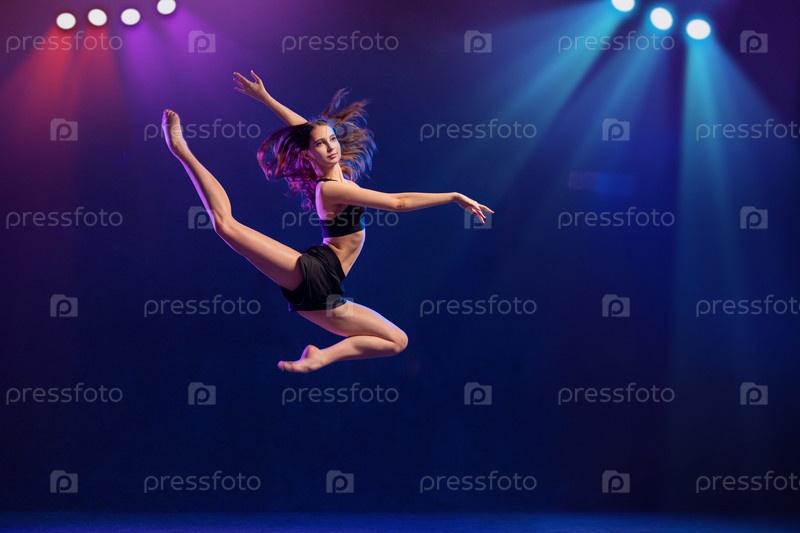 Красивая молодая исполнительница современной хореографии танцует в центре внимания на черном фоне
