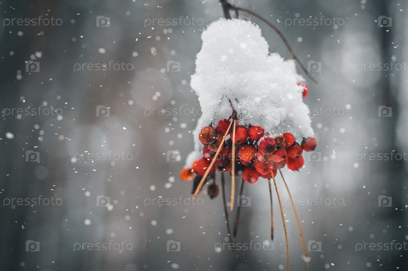 Размытая связка ягод рябины со снегом крупным планом в зимнем лесу. Абстрактный зимний фон