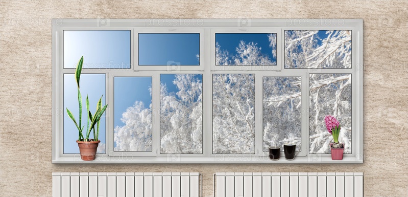 Большое пластиковое окно в квартире с видом на зимние деревья, 3D-рендеринг
