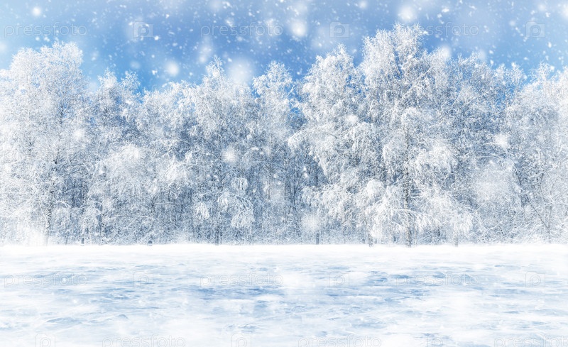 Снегопад в лесу. Белые березы покрыты инеем и снегом