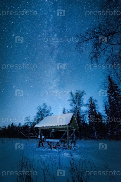 Красивый ночной зимний пейзаж. Млечный путь в небе над беседкой в лесу