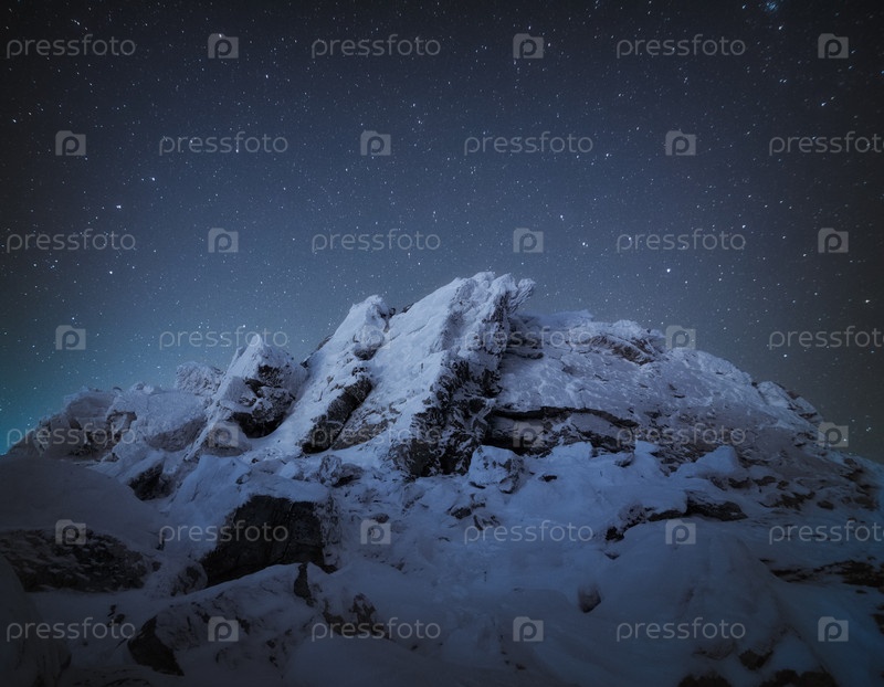 Покрытые снегом и льдом скалы под красивым звездным небом