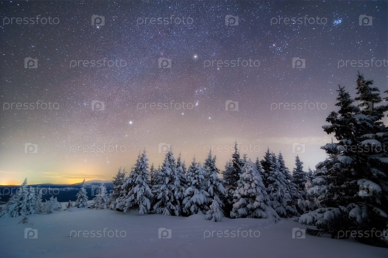 Красивый ночной зимний пейзаж. Млечный путь и созвездие Ориона в небе над покрытыми снегом деревьями на вершине горы