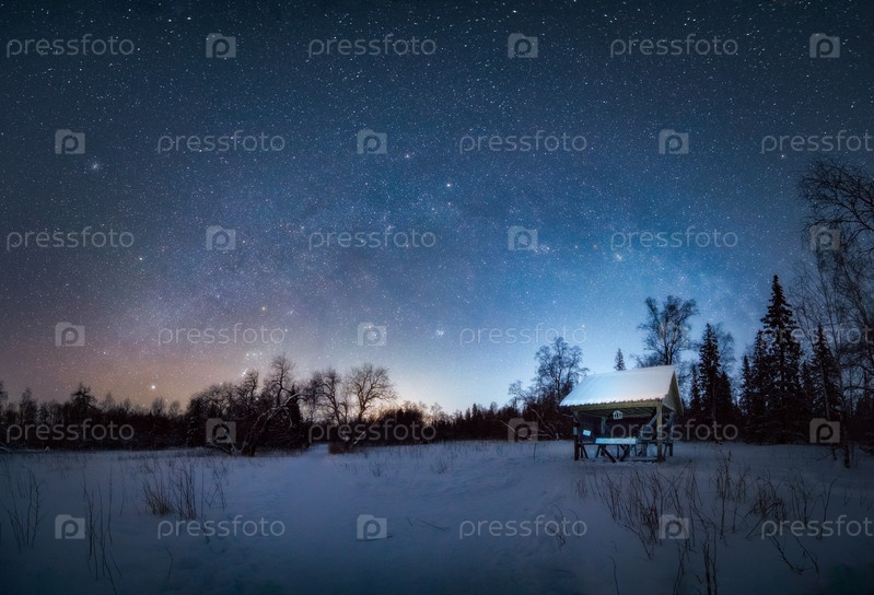 Красивый ночной зимний пейзаж. Арка Млечного пути в небе над лесом, снежным полем и беседкой