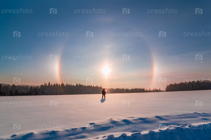Человек в снежном поле смотрит на солнечное гало