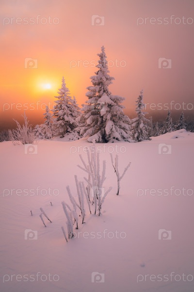 Зимний пейзаж с покрытыми снегом деревьями. Красочный морозный рассвет на вершине горы в Национальном парке Зюраткуль